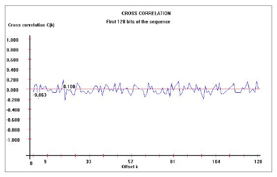 Rezultati testiranja se nalaze i na grafovima gdje je prkazana ovisnost (eng. cross correlation) između jasnog i kriptiranog testa na slici 4. i izvođenja testa na slici 5. Kao poruku koju je algoritam kriptirao je bila 512-bajtna datoteka popunjena nulama i glavni ključ također popunjen nulama.