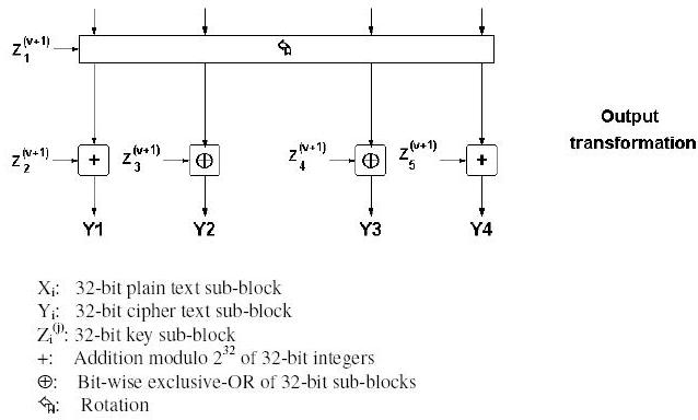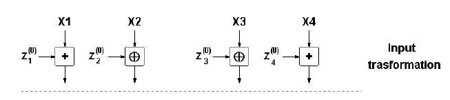 Ulazna transformacija:Ulazna transformacija dijeli ulazni 128-bitni blok podataka na 4 32-bitna podbloka X1, X2, X3, X4. Nakon čega se dobiveni podblokovi kombiniraju s 4 podključa ( svi podključevi su definirani kao Zj( i ), gdje i označava rundu, a j redni broj korištenog podključa u toj rundi ) na sljedeći način: