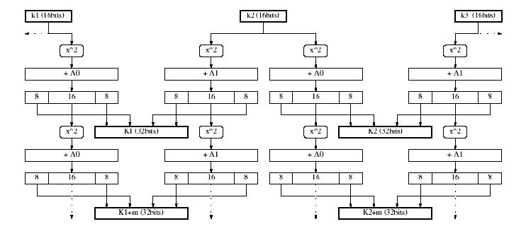 Nakon toga unutarnji bajtovi se kvadriraju i dodaje im se konstanta mod 232 ovisno o podključu kako je prokazano na slici 1.