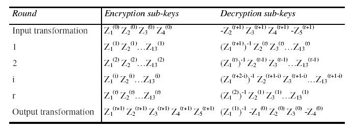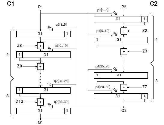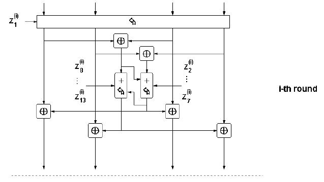 5.) P1( i ) i P2( i ) se kombiniraju s 12 32-bitinih podključeva Z2( i ), Z3( i ), .... , Z13( i ), u Z-R (zbrajajuće-rotirajućoj) strukturi opisanoj kasnije. Izlaz iz te strukture sastoji se od dva 32-bitna podbloka Q1( i ) i Q2( i ).